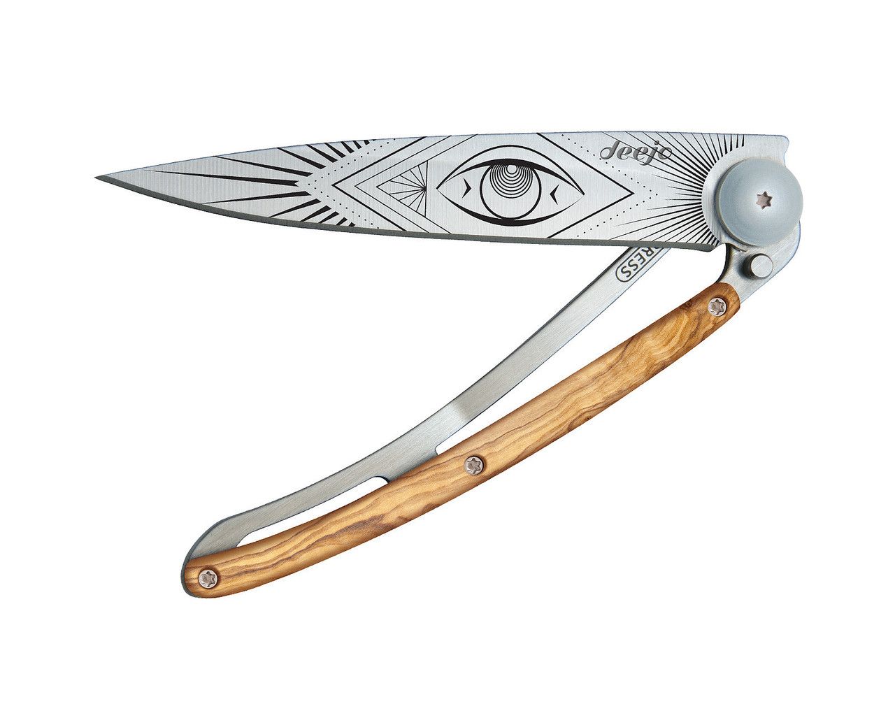 A piercing gaze from a Deejo illuminated with a beautiful handle plate in olive wood, to serve a perfect cut. For the delight of the eye, but not solely.