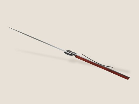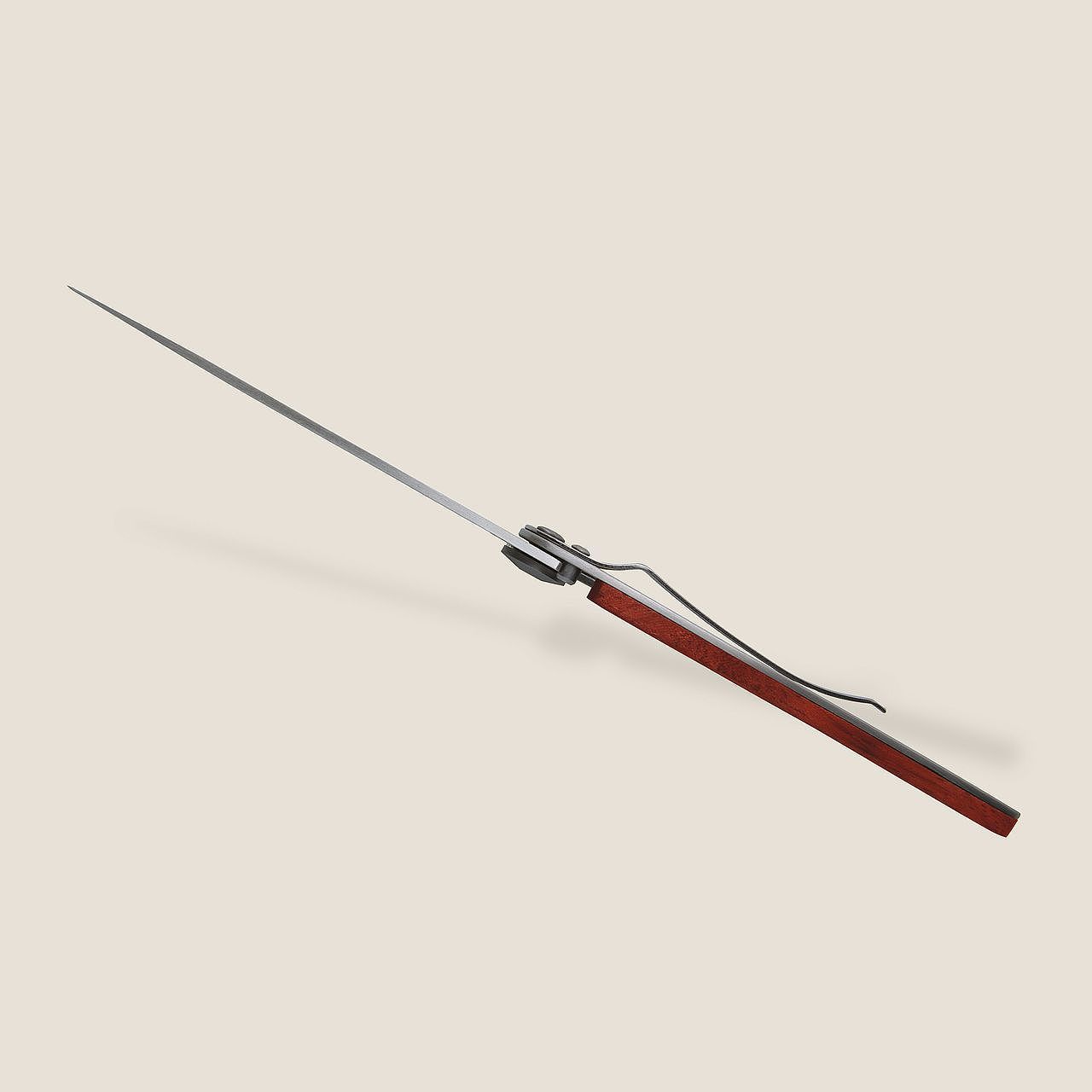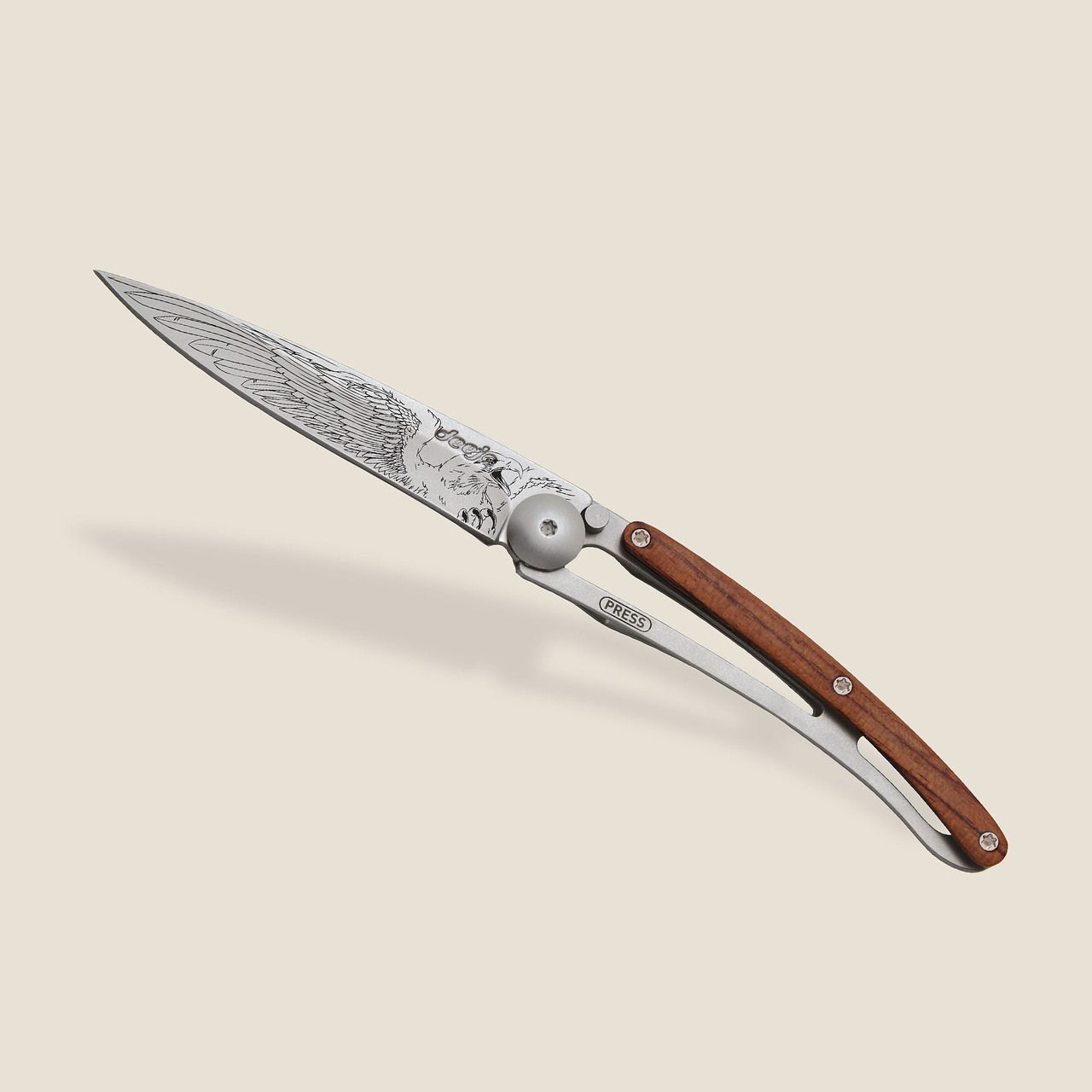 This Deejo knife is decorated with a handle plate in solid coral wood (or padauk). This species of wood has long been used in cutlery for its exquisite red/amber reflections (hence its name), robustness and excellent resistence to humidity. Here it wonderfully underscores the elegance of a Deejo knife.