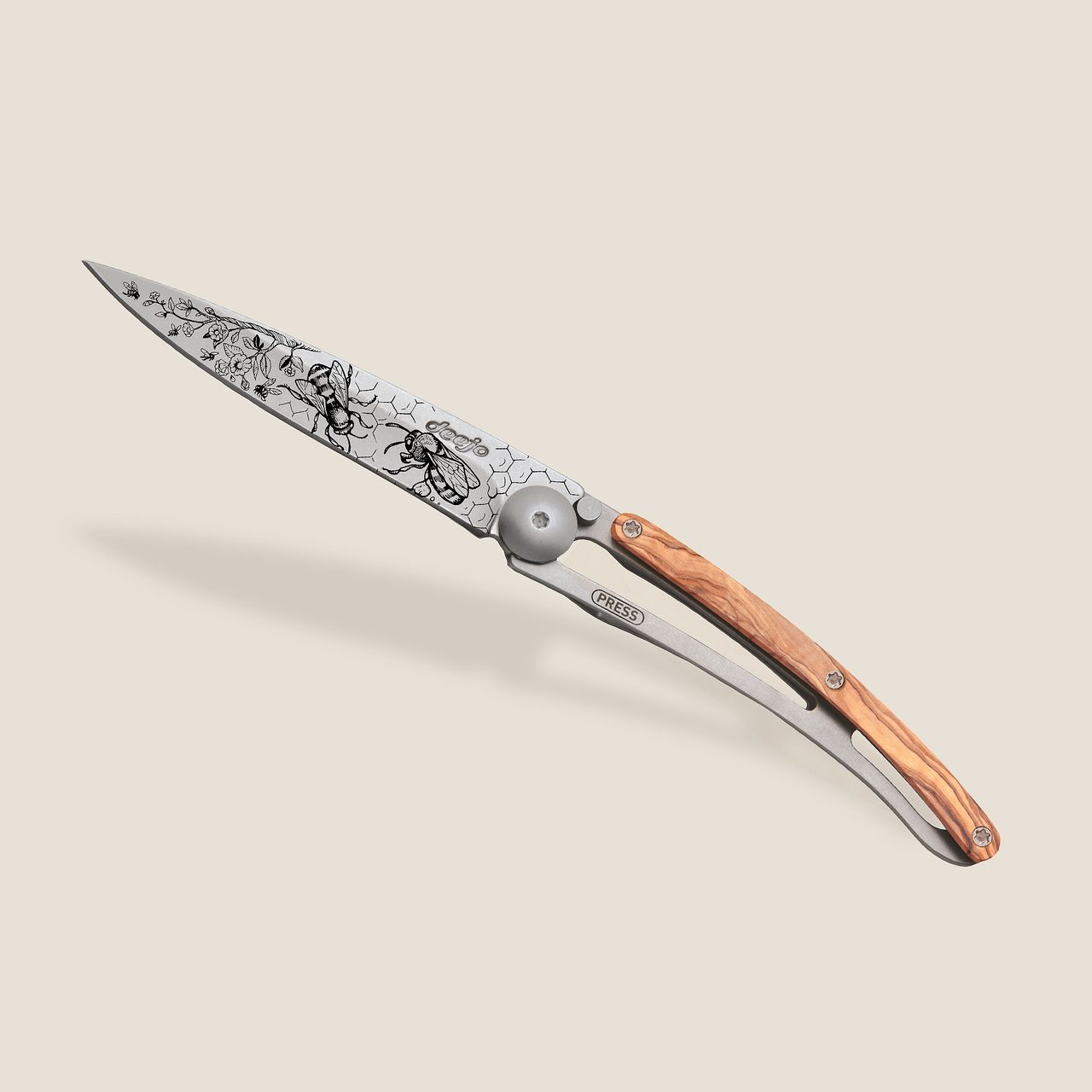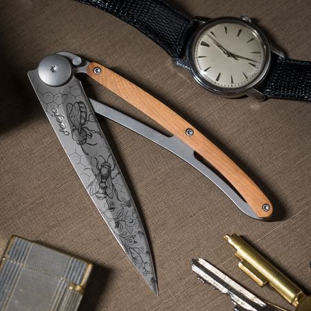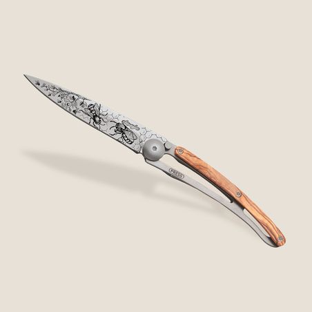 The olive wood that adorns the handle of this Deejo knife is known for its robustness and antibacterial qualities. It is a great classic of cutlery. Widely acclaimed by enthusiasts for the beauty of its natural grain, each piece is unique depending on the tree from which it is fashioned, illuminating your Deejo with superb arabesques of beige, without fear of humidity or time.