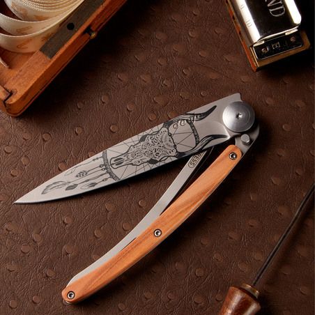 The juniper that adorns the handle of this Deejo knife is a naturally fragrant wood, offering a slightly peppery scent. In arabesques of beige, each handle plate, finely veined, makes your Deejo an exquisite and unique piece.