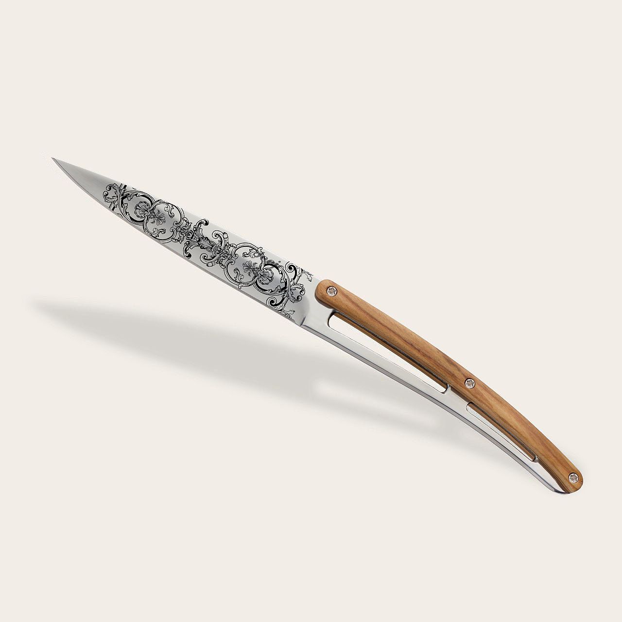 The olive wood that adorns the handle of these Deejo knives is known for its robustness and antibacterial qualities. It is a great classic of cutlery. Widely acclaimed by enthusiasts for the beauty of its natural grain, each piece is unique depending on the tree from which it is fashioned, illuminating your Deejo with superb arabesques of beige, without fear of humidity or time.