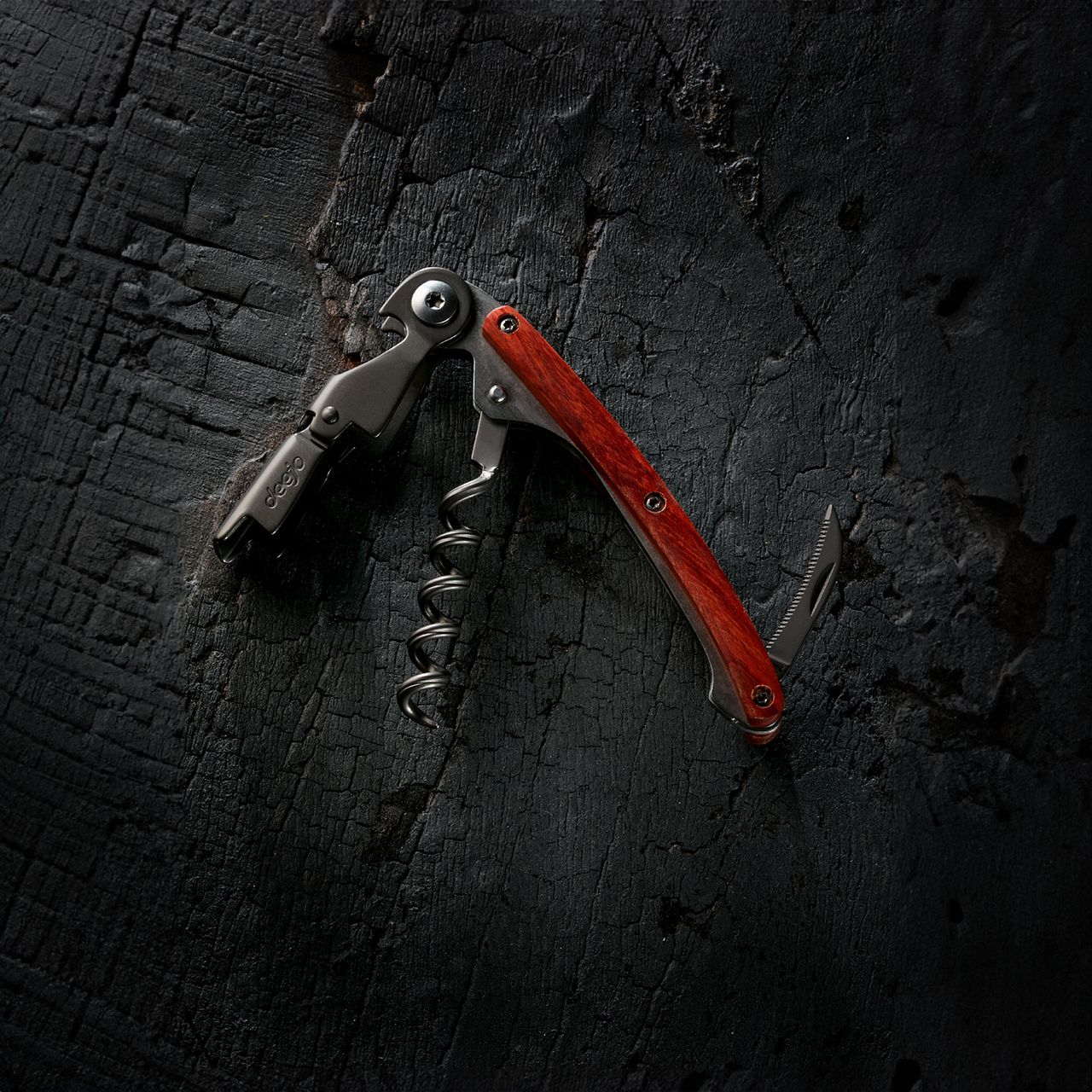 Cuchillo de camarero de acero inoxidable con acabado de titanio gris antracita. Doble palanca articulada y cierre rápido. Mecha de 5 espirales con revestimiento antiadherente. Hoja microdentada. Mango de madera de Coral.