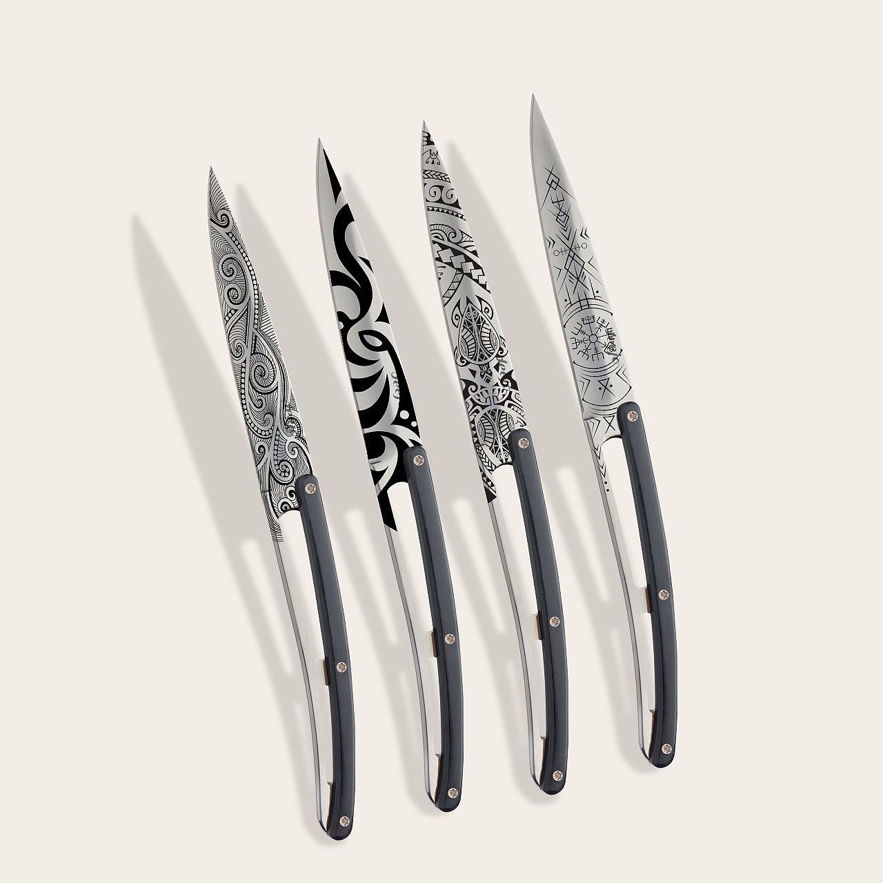 Este juego de 4 cuchillos de mesa, sutil combinación entre tradición y modernidad, ostenta un grabado distinto en cada una de sus hojas que respeta la armonía del conjunto y es una excelente muestra de atención y cortesía hacia cada comensal. Un detalle adicional, por si fuera poco, para convertirse en tema de conversación y objeto de deseo...