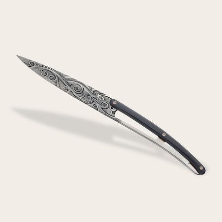 La madera de ébano que adorna el mango de estos cuchillos Deejo es una auténtica oda al negro más intenso. Esta excepcional madera tiene la particularidad de permanecer prácticamente inalterable frente a la humedad del aire. Asimismo, esta resulta ser la madera más densa, resistente y excepcional que existe, características que la erigen como la materia ideal para estas magníficas piezas de cuchillería.