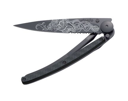 Una Deejo con aspecto salvaje, su hoja microdentada y su apertura con una sola mano, realzada con un lobo que aúlla a la luna y magnificada por los tonos con matices grises de la fibra de carbono.