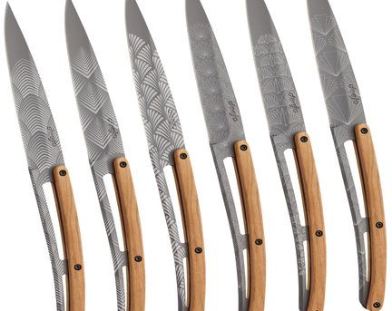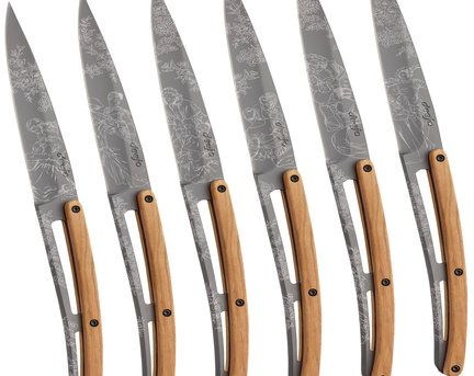Los famosos estampados de la toile de Jouy han inspirado a Deejo una asombrosa colección: descubra la riqueza de estos motivos seculares a través de 6 grabados en cuchillos de mesa excepcionales.