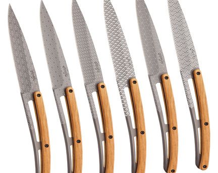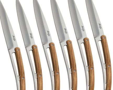 Un clásico de la cuchillería reinterpretado por Deejo donde los arabescos de madera de olivo se combinan a las mil maravillas con los reflejos brillantes del acero inoxidable: seis cuchillos de...