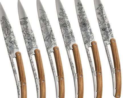 Deejo reinventa una manera original de decorar sus mesas con flores en torno a estos 6 grabados campestres que destacan admirablemente las elegantes líneas de estos relucientes cuchillos de mesa.