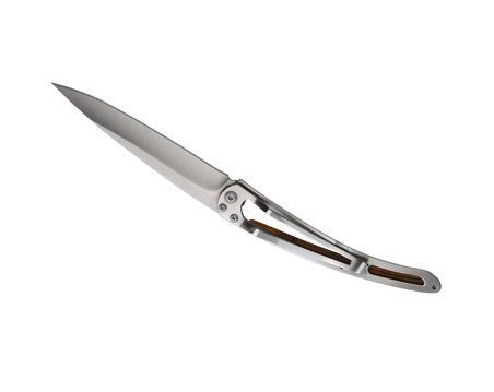 Navaja ultraligera de acero inoxidable 420, acabado mate. Hoja con seguro tipo “liner lock” con fino grabado láser. Clip para cinturón. El mango está adornado con una placa de madera del enebro maciza.El enebro es una madera naturalmente aromática, que desprende una fragancia ligeramente pimentada. Su aspecto, caracterizado por una mezcla de beiges de diferente intensidad, finamente nervado , hacen de su Deejo una pieza única y preciosa.