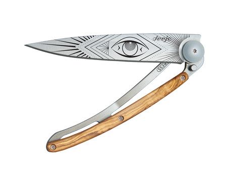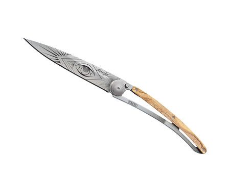 Navaja ultraligera de acero inoxidable 420, acabado mate. Hoja con seguro tipo “liner lock” decorado con fino grabado láser. Clip para cinturón. Reconocida por su robustez y sus cualidades antibacterianas, la madera de olivo es un gran clásico de la cuchillería. Muy elogiada por sus aficionados por la belleza de su veteado natural, cada pieza es única según el árbol del que procede, ilumina su Deejo con extraordinarios arabescos de beiges, y no se altera con la humedad ni con el paso del tiempo.