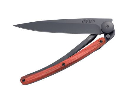 Para el placer de la vista, una navaja Deejo de 37 gramos con matices negros, adornada con una magnífica plaqueta de haya maciza teñida de azules indecisos entre cielo y mar…