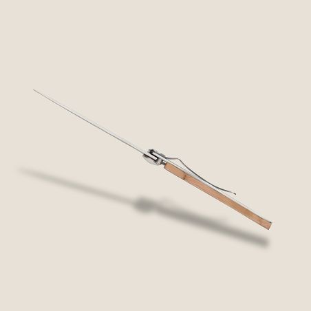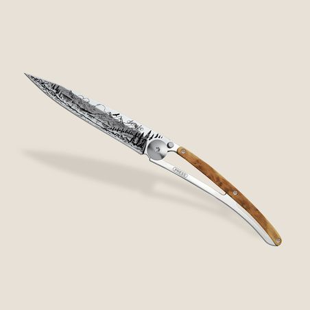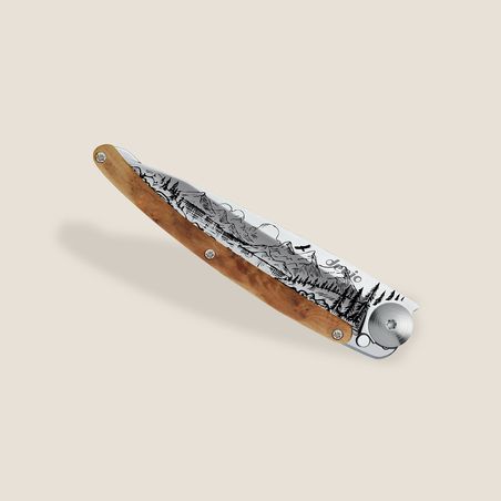 Navaja ultraligera de acero inoxidable Z40C13, acabado espejo. Hoja con seguro tipo “liner lock” decorado con fino grabado láser. Clip para cinturón. Mango de madera de enebro.