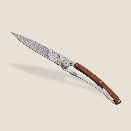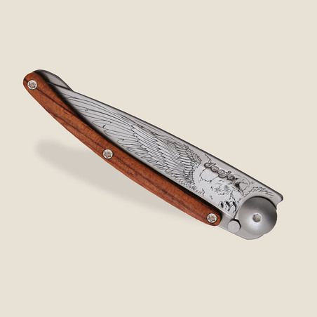 Esta navaja Deejo está adornada con una plaqueta de madera de coral maciza. La utilización en cuchillería de este tipo de madera se remonta a mucho tiempo atrás por los hermosos reflejos rojizos o ambarinos que le han dado su nombre, su solidez y su excelente resistencia a la humedad. Aquí el material realza a la perfección la elegancia de este diseño Deejo.