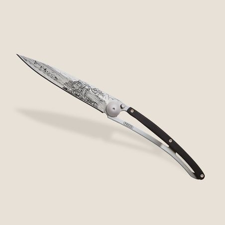 Navaja ultraligera de acero inoxidable Z40C13, acabado mate. Hoja con seguro tipo “liner lock” con fino grabado láser. Clip para cinturón. Mango de ébano.