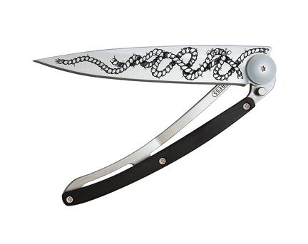 Clásico del universo del tatuaje, este delicado motivo polinesio adorna la hoja de una navaja Deejo robusta con hoja microdentada que se maneja con una sola mano.